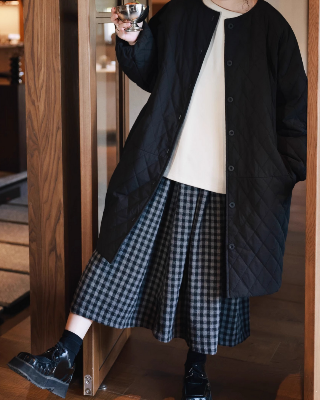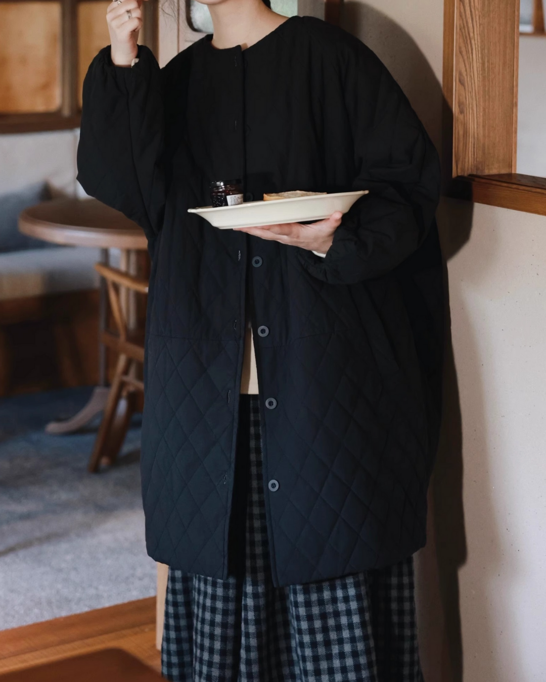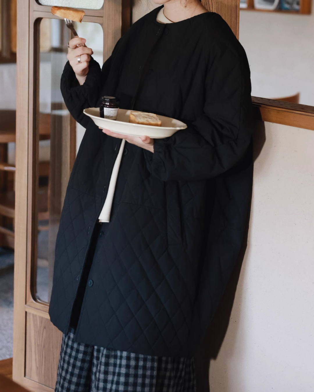 ノーカラーキルティングロングコート 2741